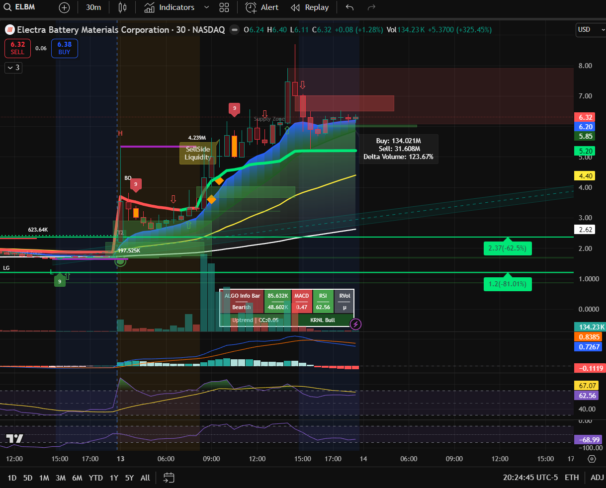 • $ELBM displayed a powerful uptrend, breaking out above the key resistance at $6.32 on a surge in volume. The session began with a gap up, followed by a strong rally that saw price action interact with support at $5.85 before pushing through resistance. Candlestick patterns on the TradingView Superchart show a series of bullish green candles, with volume bars spiking during the breakout phase—confirming strong buying interest and momentum.