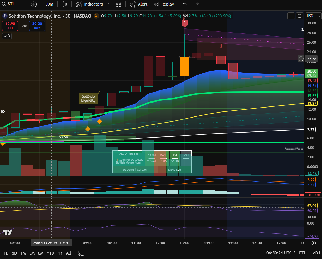 The TradingView Superchart for $STI on October 13, 2025, displays a textbook momentum breakout. After opening at $11.59 (well within the watchlist entry zone), the stock dipped to $9.63 before launching into a powerful uptrend. Multiple bullish candlesticks pushed the price to a high of $27.71 before consolidating above key support at $13.96 and resistance at $18.70.