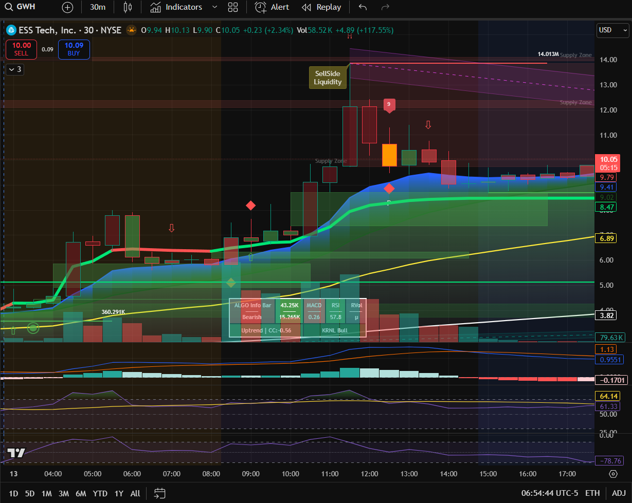 The TradingView Superchart for $GWH on October 13, 2025, shows a powerful momentum breakout. The stock opened near the lower entry zone ($5.60), quickly surged through all resistance levels, and reached a high of $14.01 before retracing and consolidating above $9.00. The chart displays strong bullish candlesticks in the morning session, with volume spikes aligning with each breakout and supply zone test. Price action respected the VWAP ($9.41) and key moving averages, with the RSI peaking above 64, indicating strong but not overbought momentum. The chart also highlights a “SellSide Liquidity” zone near the highs, where profit-taking and supply capped further upside. No significant after-hours volatility was observed; the main move occurred intraday.
